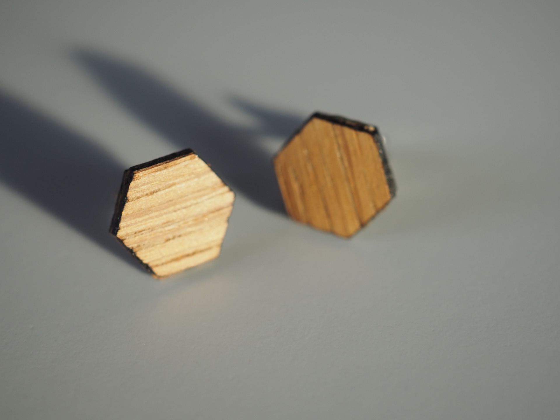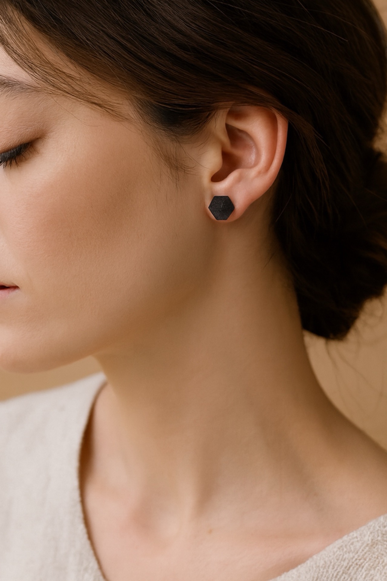 A fusion of geometric elegance and natural allure. These petite hexagonal studs comes in two variants, one natural and one burned black. Each piece is cut from recycled oak wood. The hexagon shape symbolizes balance and harmony. The sterling silver backs ensures skin safety.