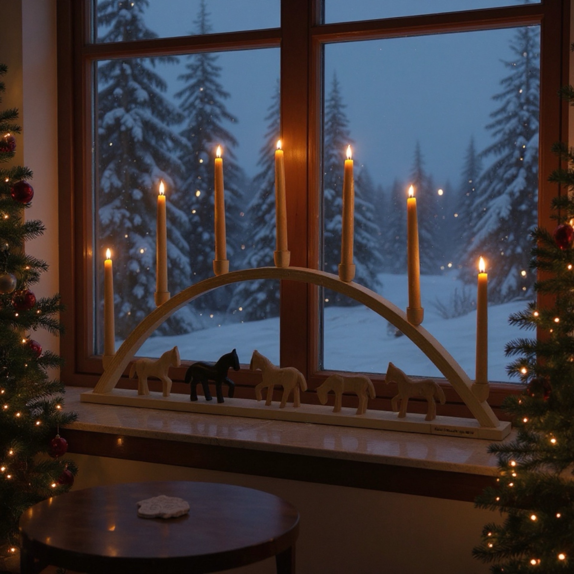 Vår ljusbåge grundar sig i den gamla Staffansbågen som min farfar gjorde i Vadstena. Vi har moderniserat bågen och behållt endast hästarna. Vi använder farfars mallar fortfarande men täljer och slipar hästarna lite mer än han brukade göra. Vi har också valt att låta bågen vara obehandlad. Naken helt enkelt. På så vis passar denna masterpeace att ha framme året runt. Och det vill man ju med ett så stort och värdefullt hantverk så du kan njuta av den varje dag.